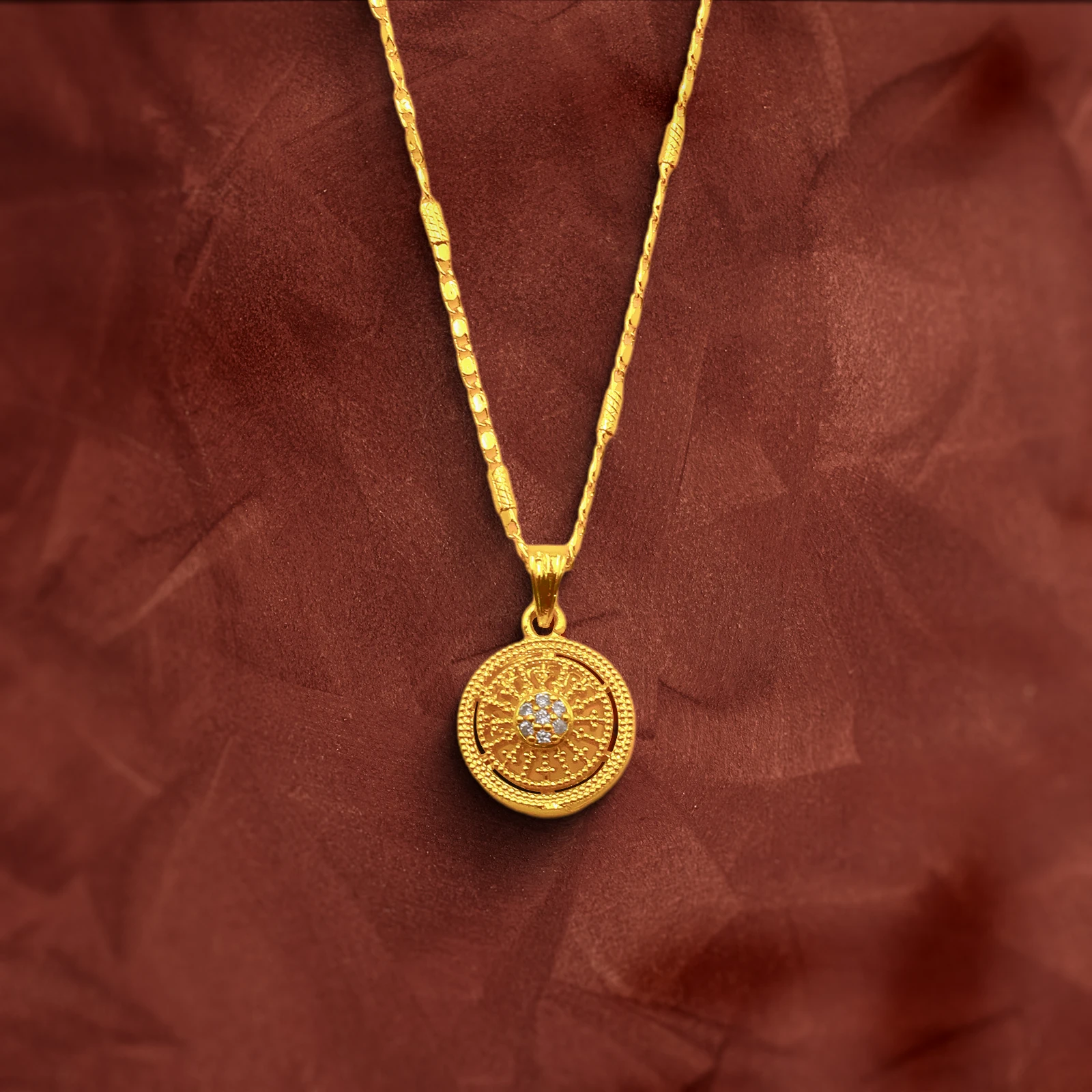Wear this round-shaped gold-plated flower pendant that showcases brilliant zircon stones and carries the essence of spring wherever you go.